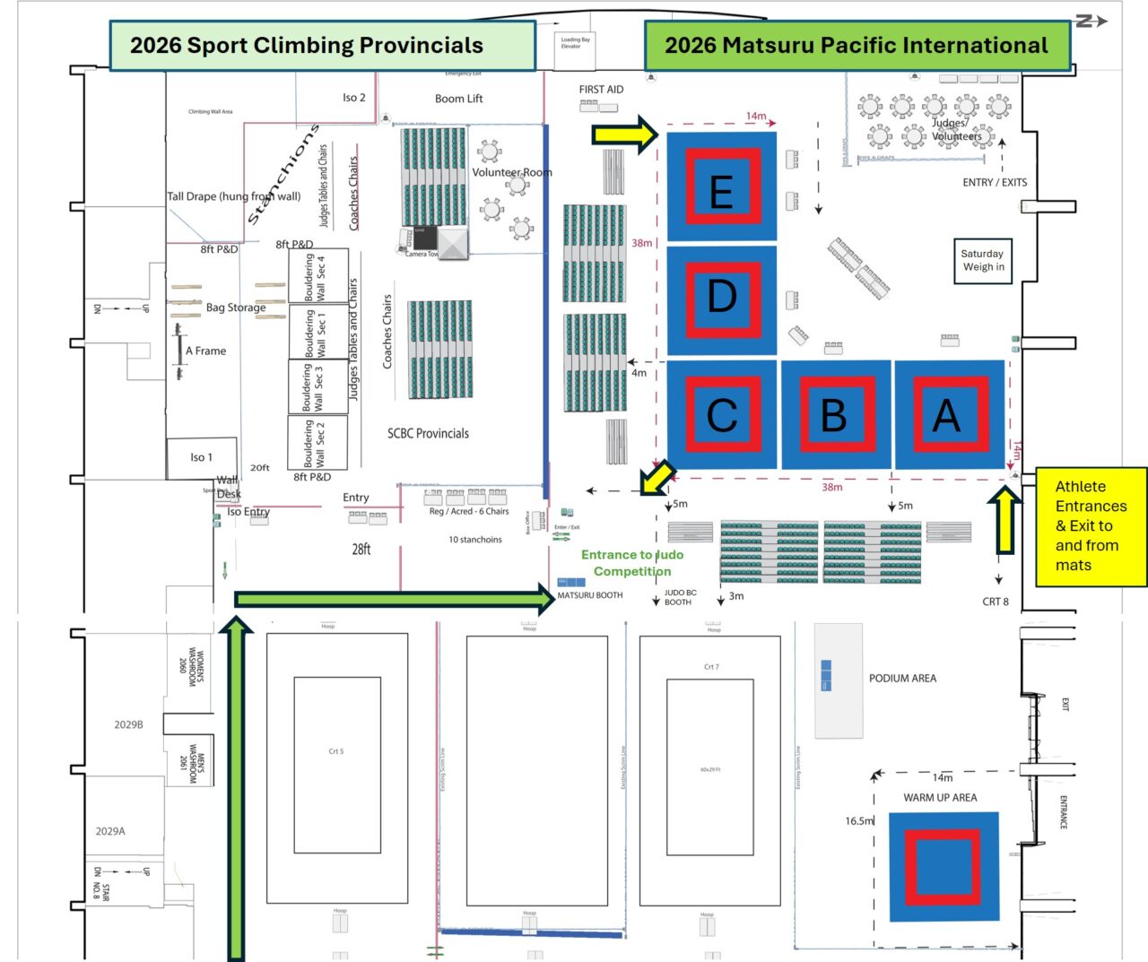 - Athletes will need to use the Entrances and Exit to enter and exit the mats. See yellow arrows.